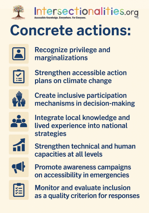 2. Strengthen accessible climate change action plans → Support governments and municipalities in creating risk and emergency management plans with accessibility and universal design, including accessible formats for information, alerts, and response.